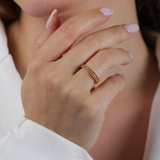 A estrutura delicada do Anel Flora combina traços suaves com a precisão do acabamento cravejado em zircônia, criando um brilho discreto e refinado.
