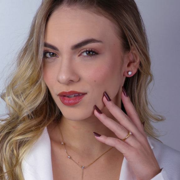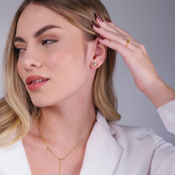 Seu ponto de luz em zircônia traz um brilho limpo e discreto, emoldurado por detalhes minimalistas dourados.