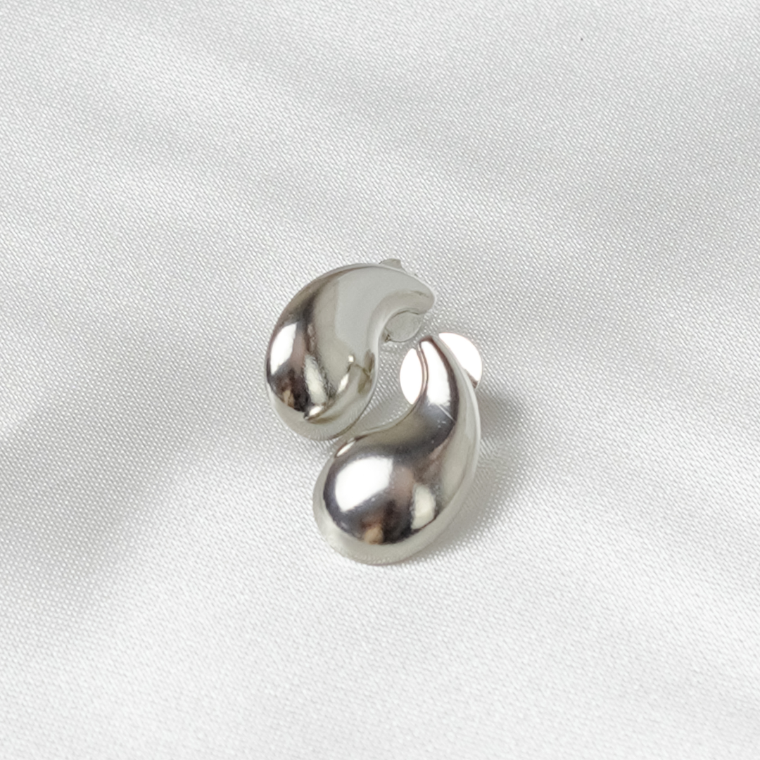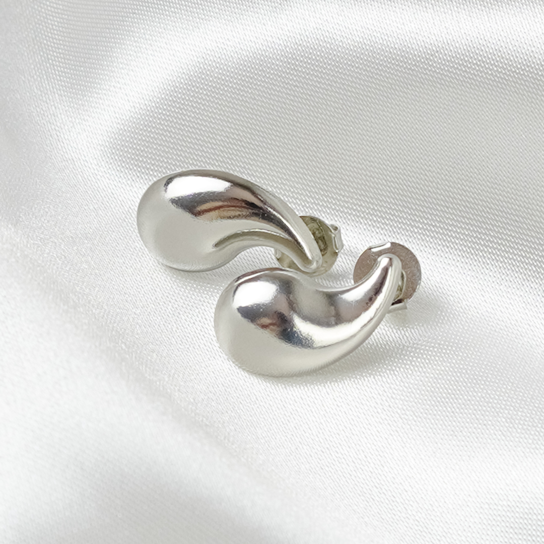 O Brinco Karine Prateado destaca-se pelo design curvado em forma de gota, combinando modernidade e elegância.