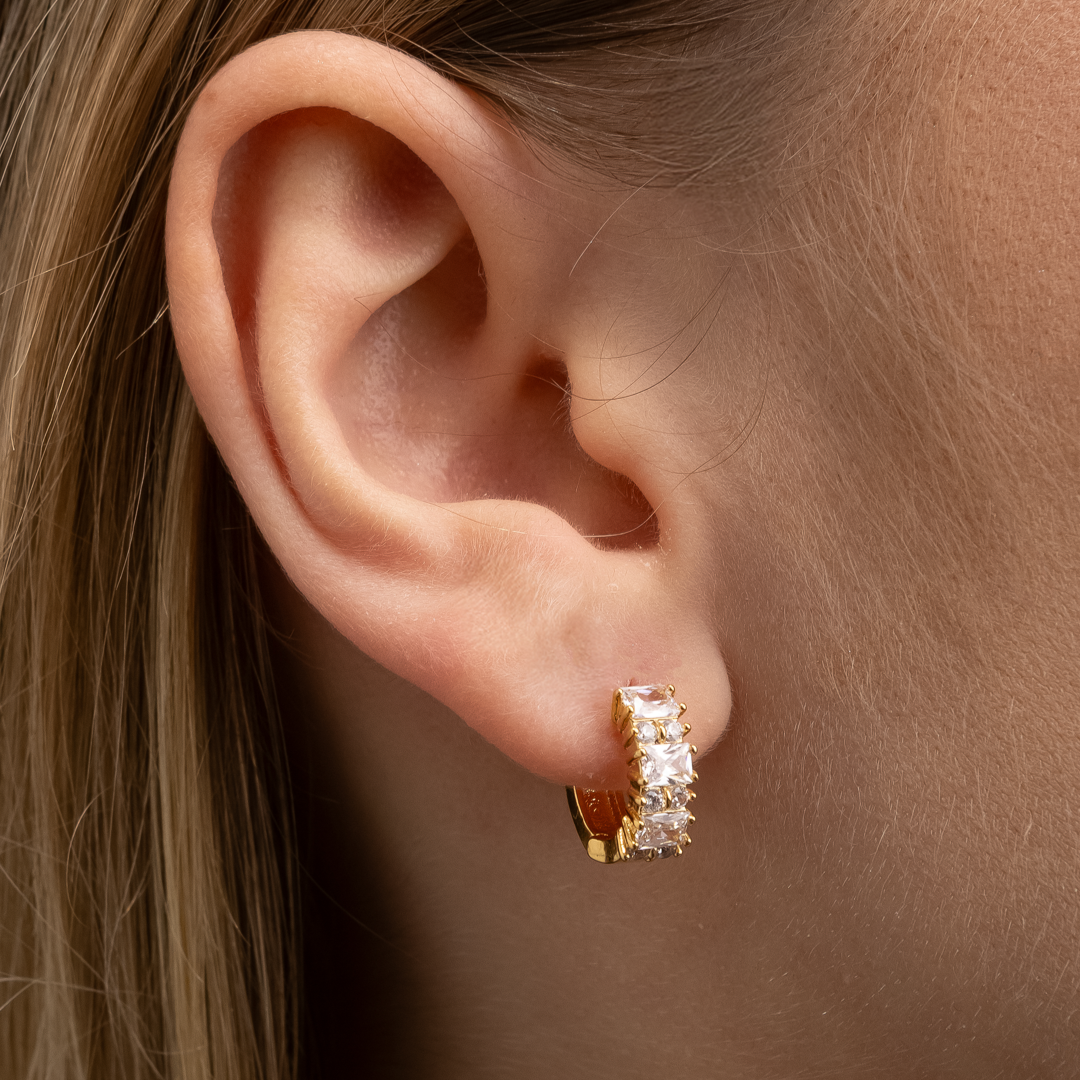 O Brinco Marcela Dourado de Argolinha com 7 Pedras de Zircônia equilibra presença e discrição de forma sutil e refinada.