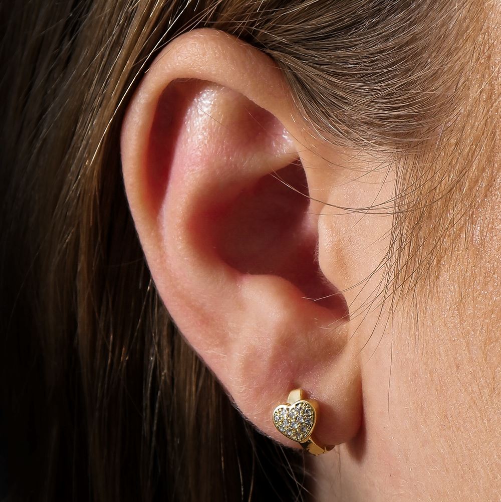 Brinco Patrícia Dourado de Argolinha Pequeno Coração Cravejado de Pedras