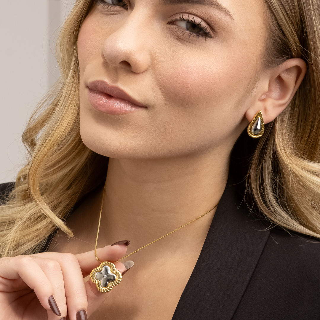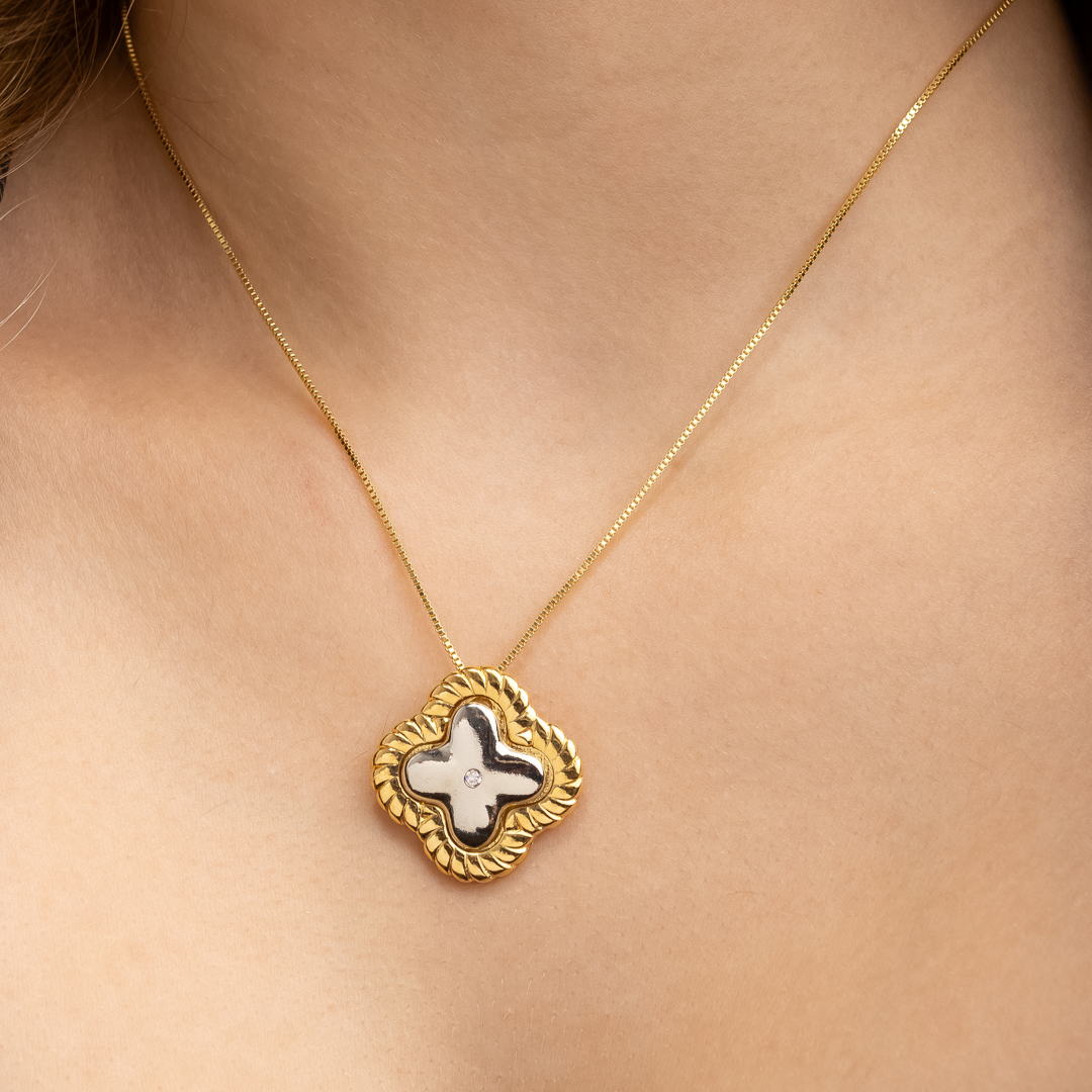 O Colar Barroca apresenta um design harmonioso que une os tons dourado e prateado, formando uma delicada flor que exala sofisticação.