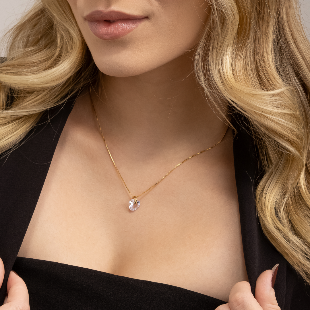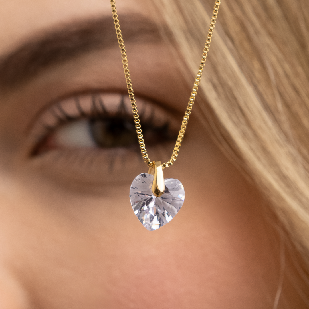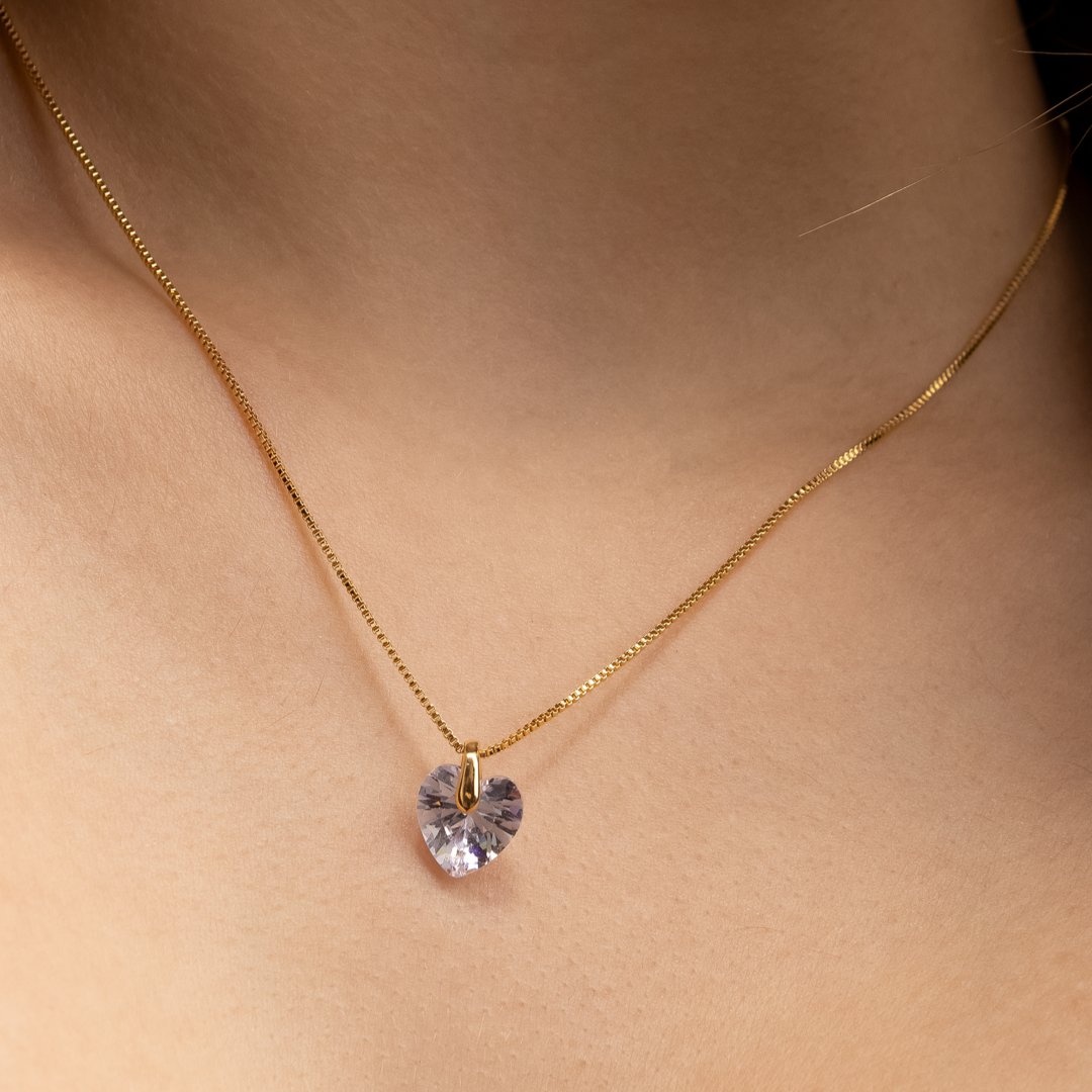 A delicadeza do pingente em formato de coração revela uma feminilidade serena.
